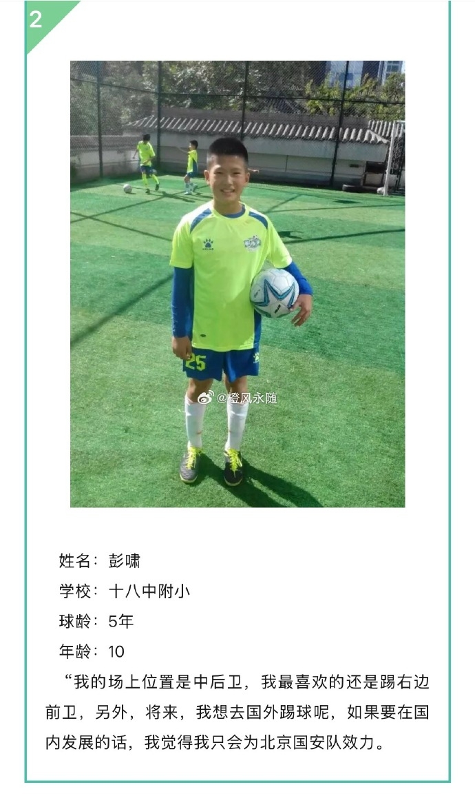 01月22日讯 今日,著名山东泰山博主橙风永随晒出彭啸10岁时一张照片。该博主原文15年,年仅10岁的彭啸接受“教育圆桌杯”少儿足球赛采访时说:“我的场上位置是中后卫,我最喜欢的还是踢右边前卫,另外,将来,我想去国外踢球呢,如果要在国内发展的话,我觉得我只会为北京国安队效力。 ...